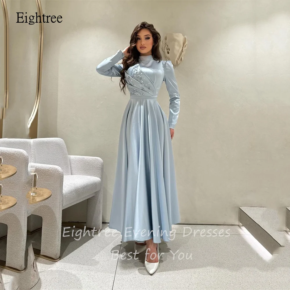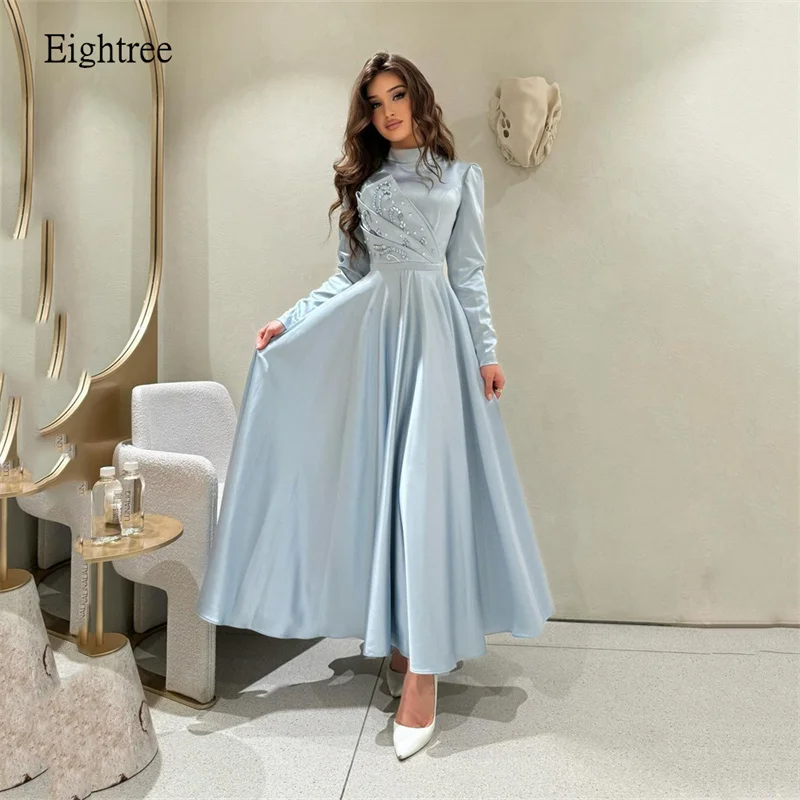 Eightree Blue Elegant A-Line Evening Dresses High Neck Prom Gown Full Sleeve Saudi Arabia Formal Party Gowns vestidos de festa