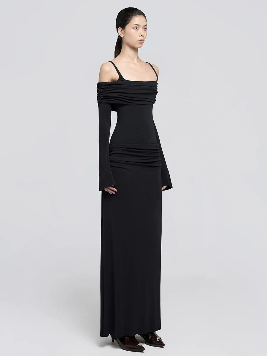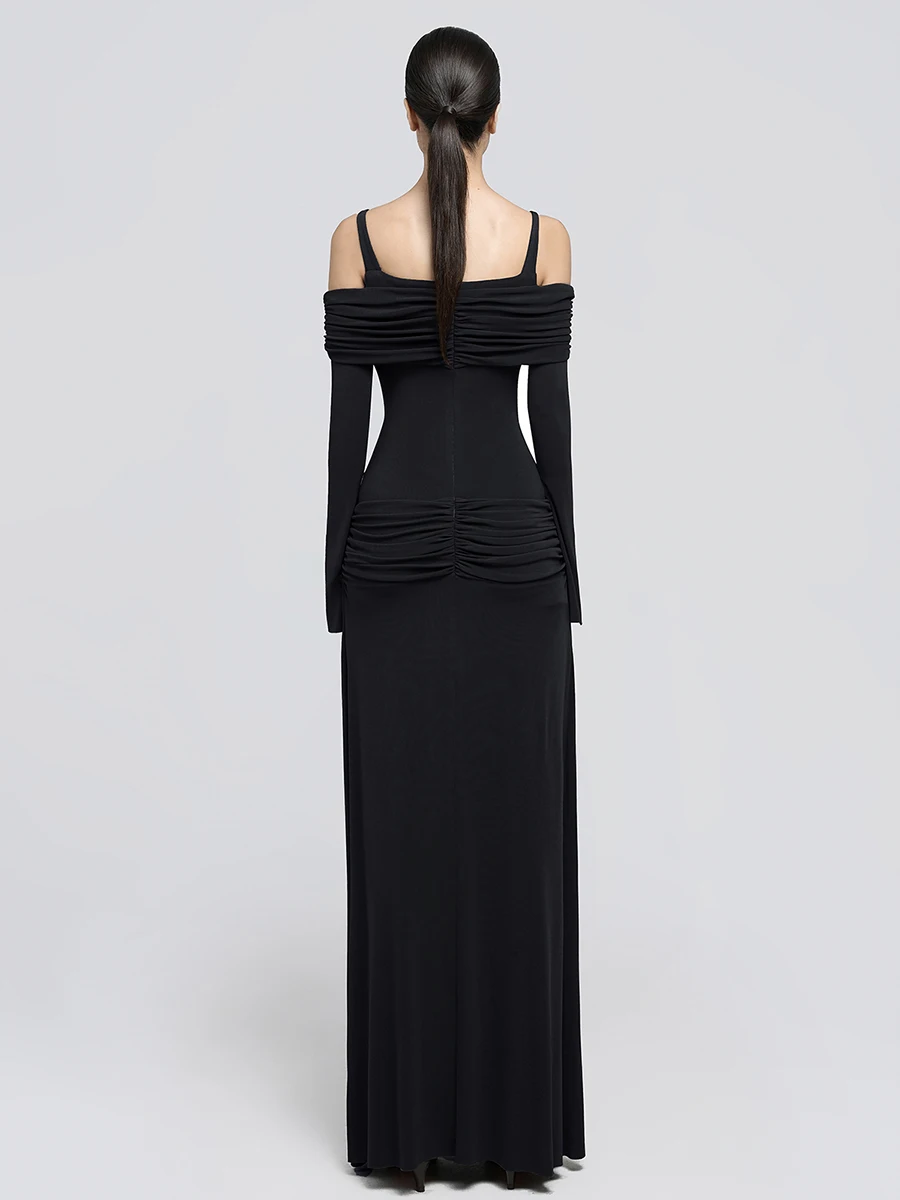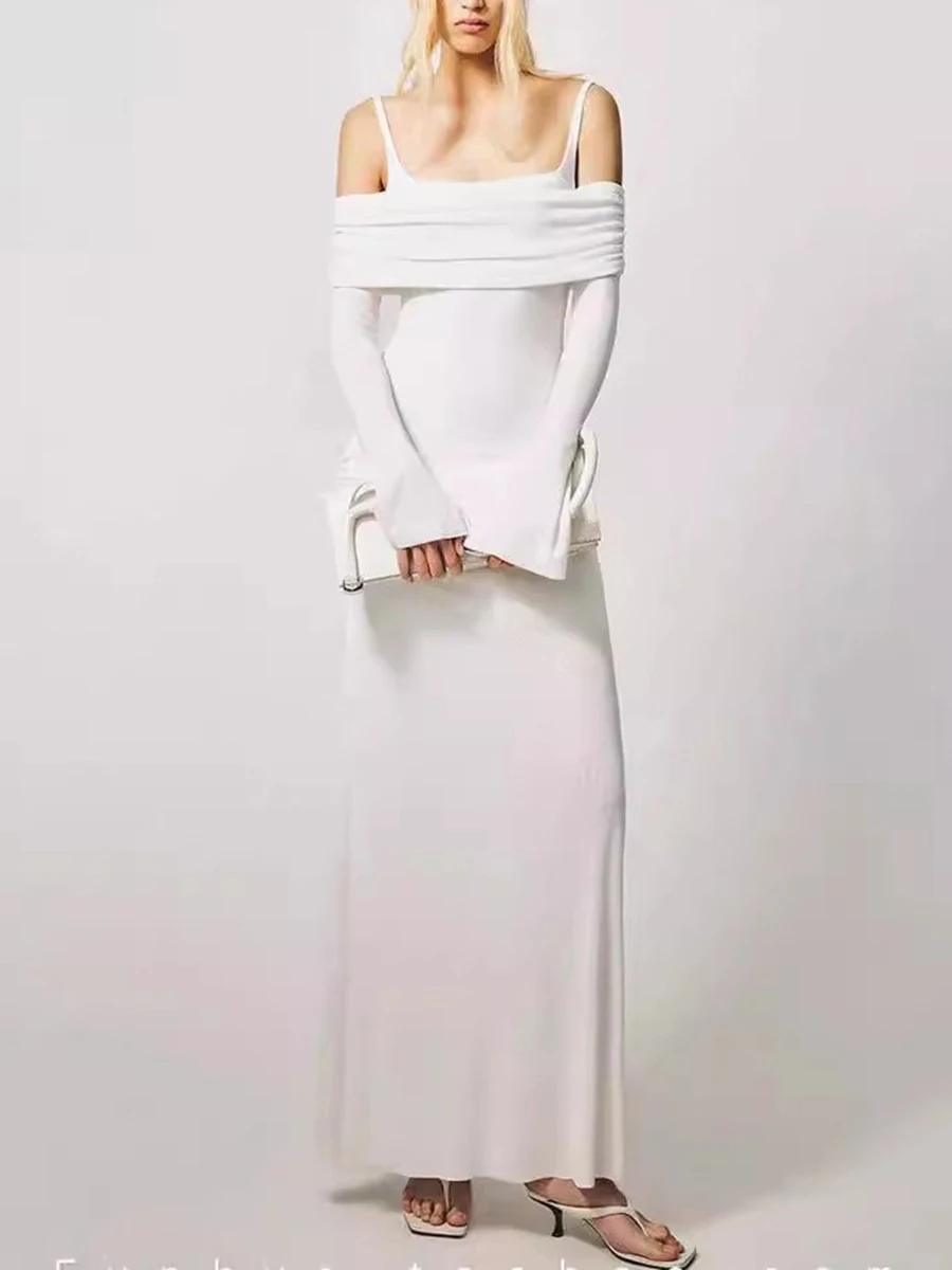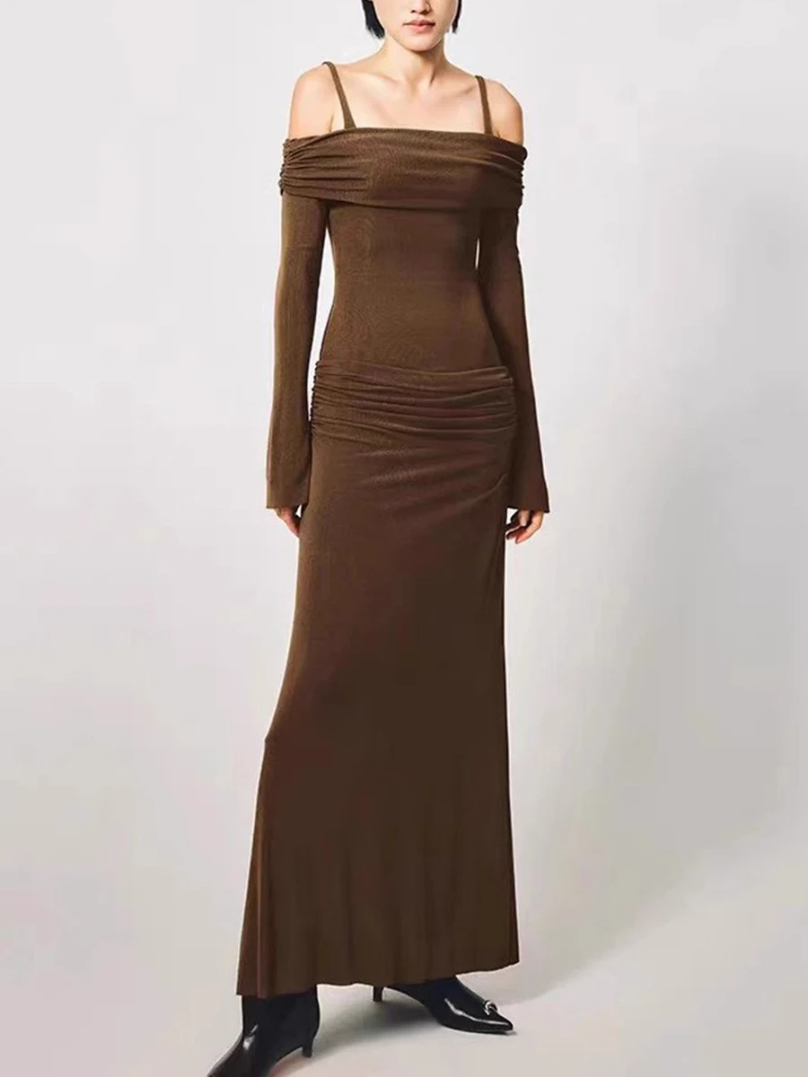 VGH Streetwear Backless Folds Long Dresses For Women Square Collar Off The Shoulder Sleeve High Waist Slim Solid Dress Female
