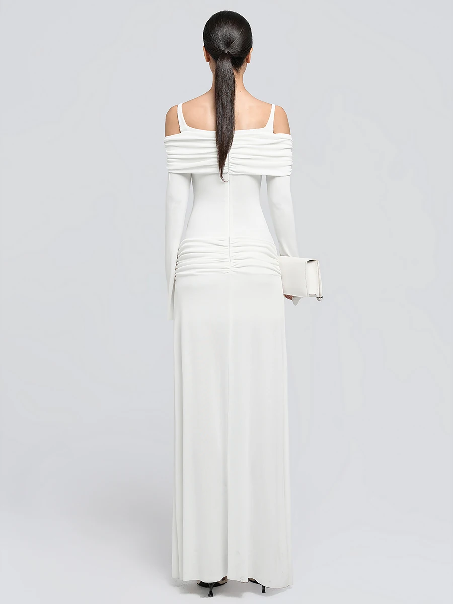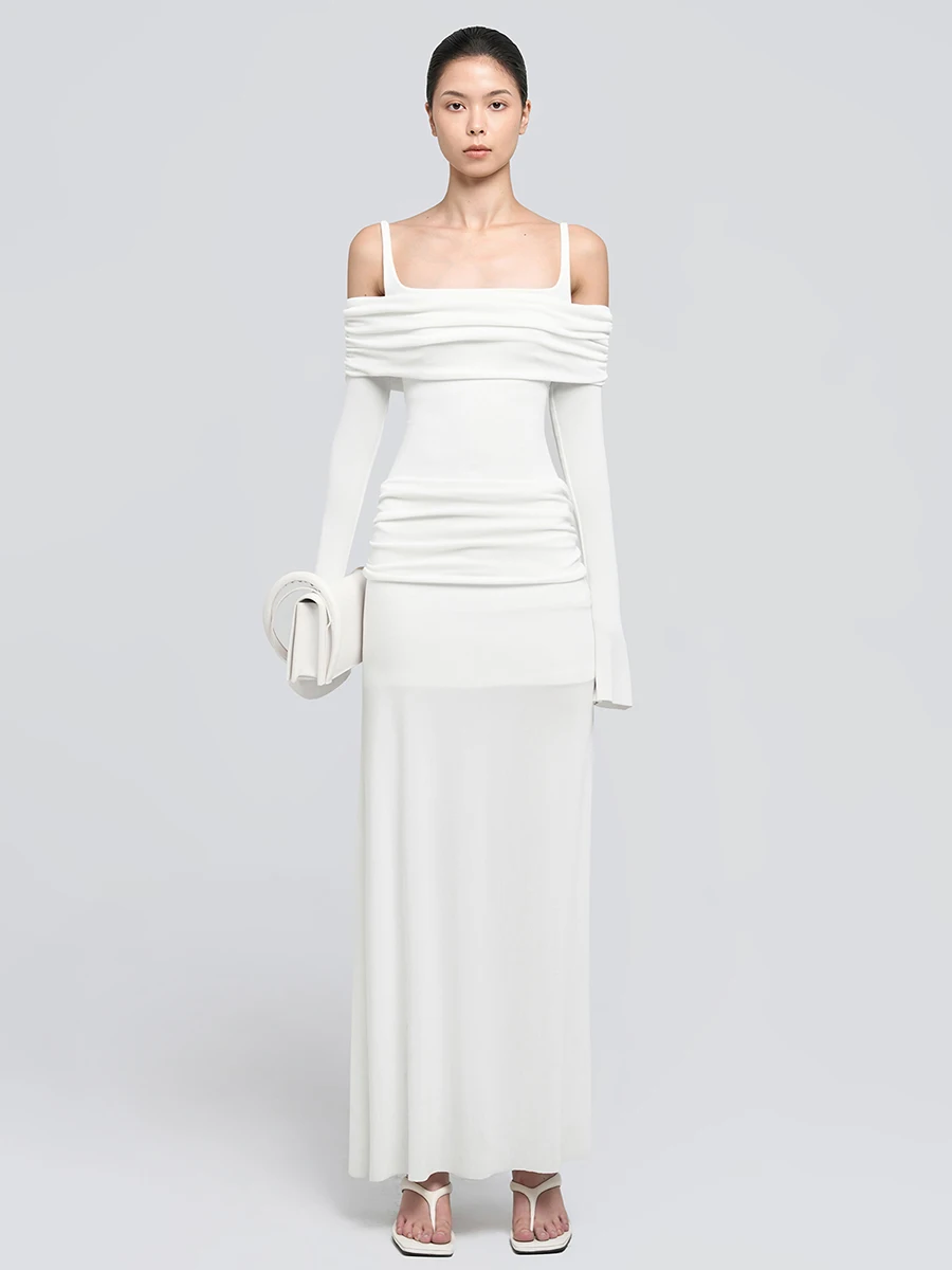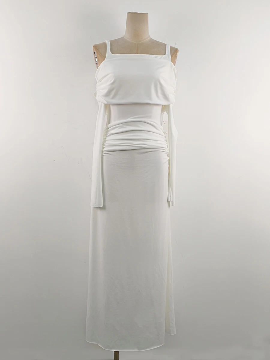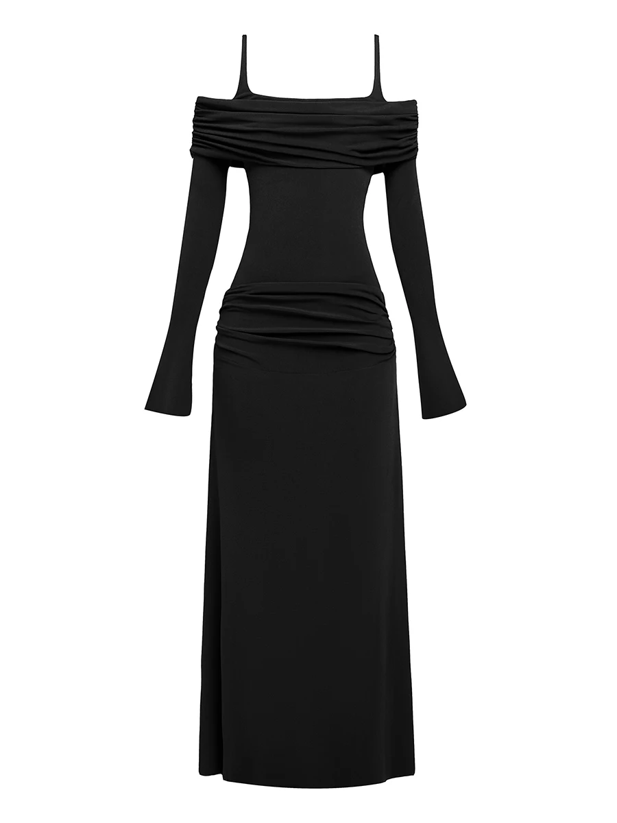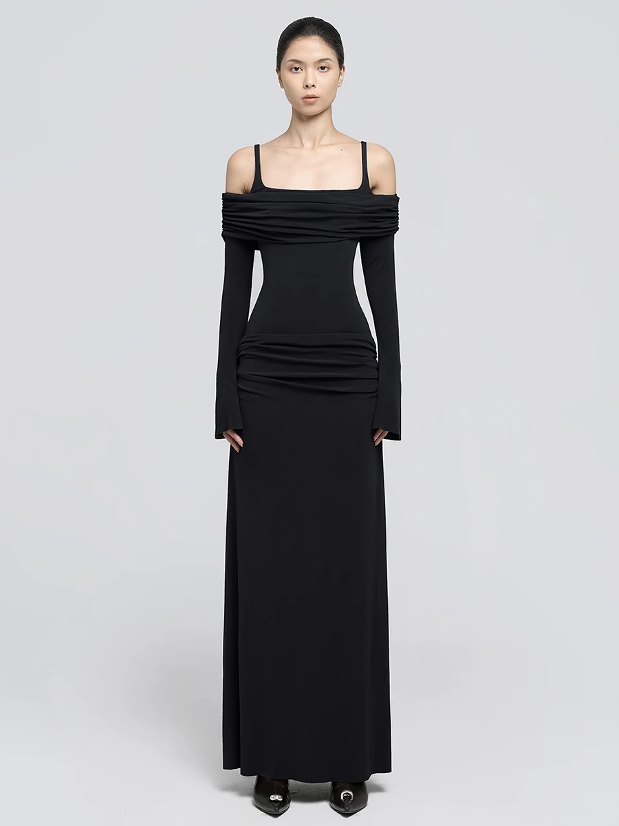 VGH Streetwear Backless Folds Long Dresses For Women Square Collar Off The Shoulder Sleeve High Waist Slim Solid Dress Female