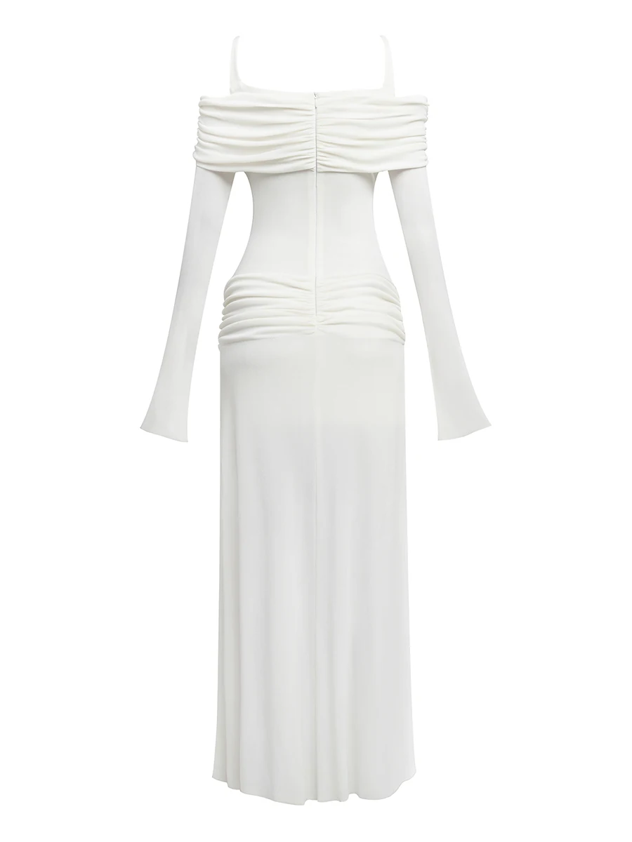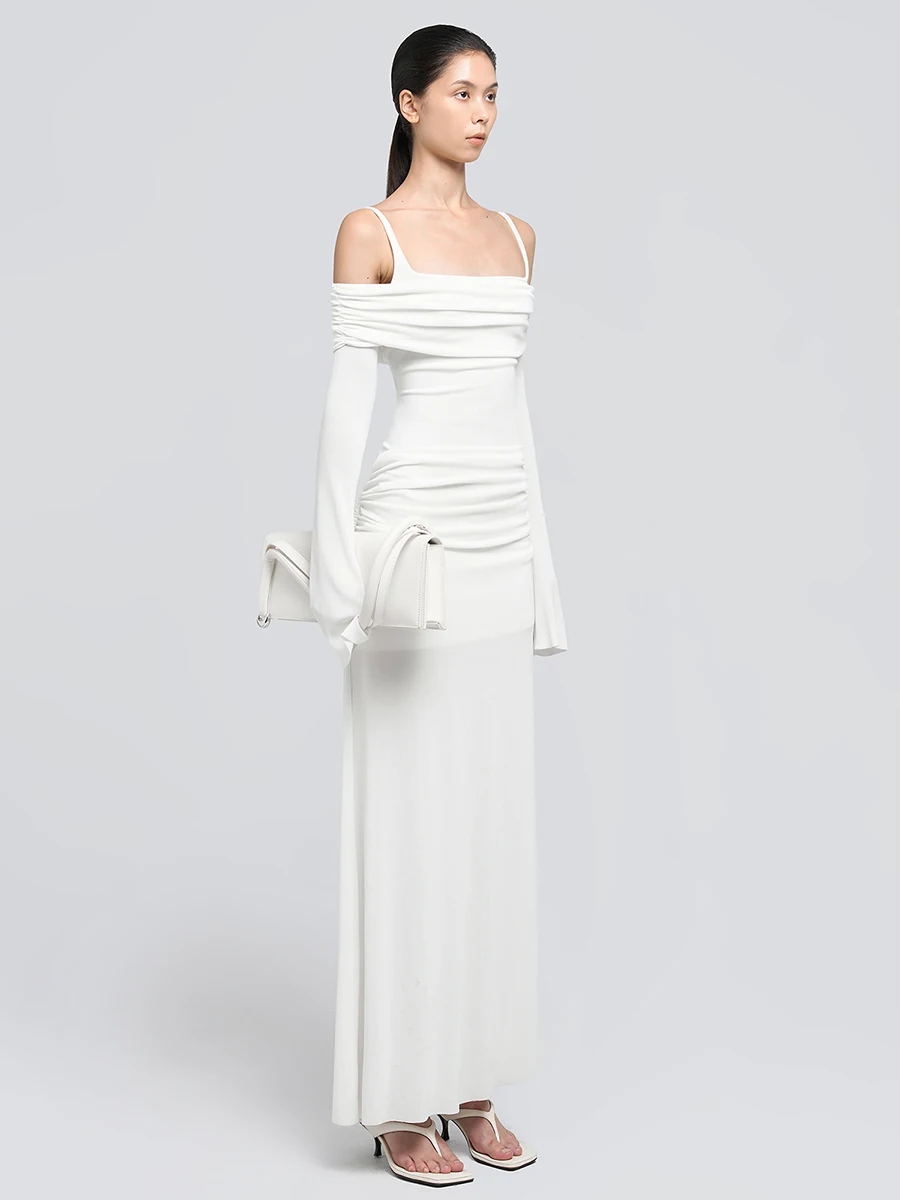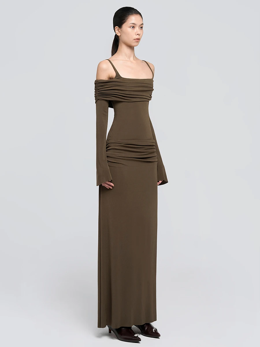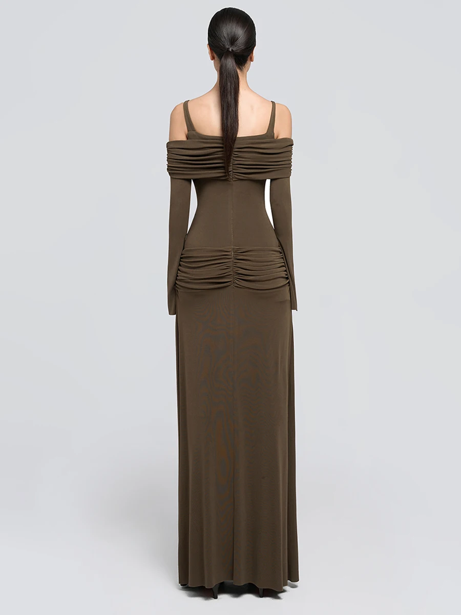 VGH Streetwear Backless Folds Long Dresses For Women Square Collar Off The Shoulder Sleeve High Waist Slim Solid Dress Female