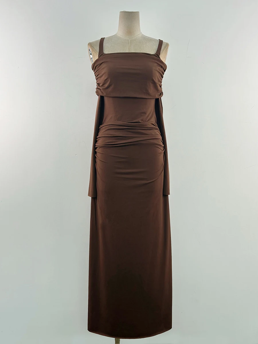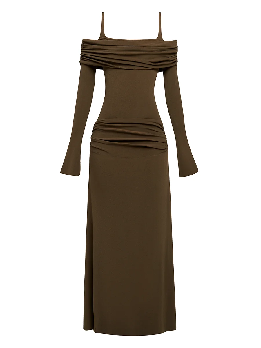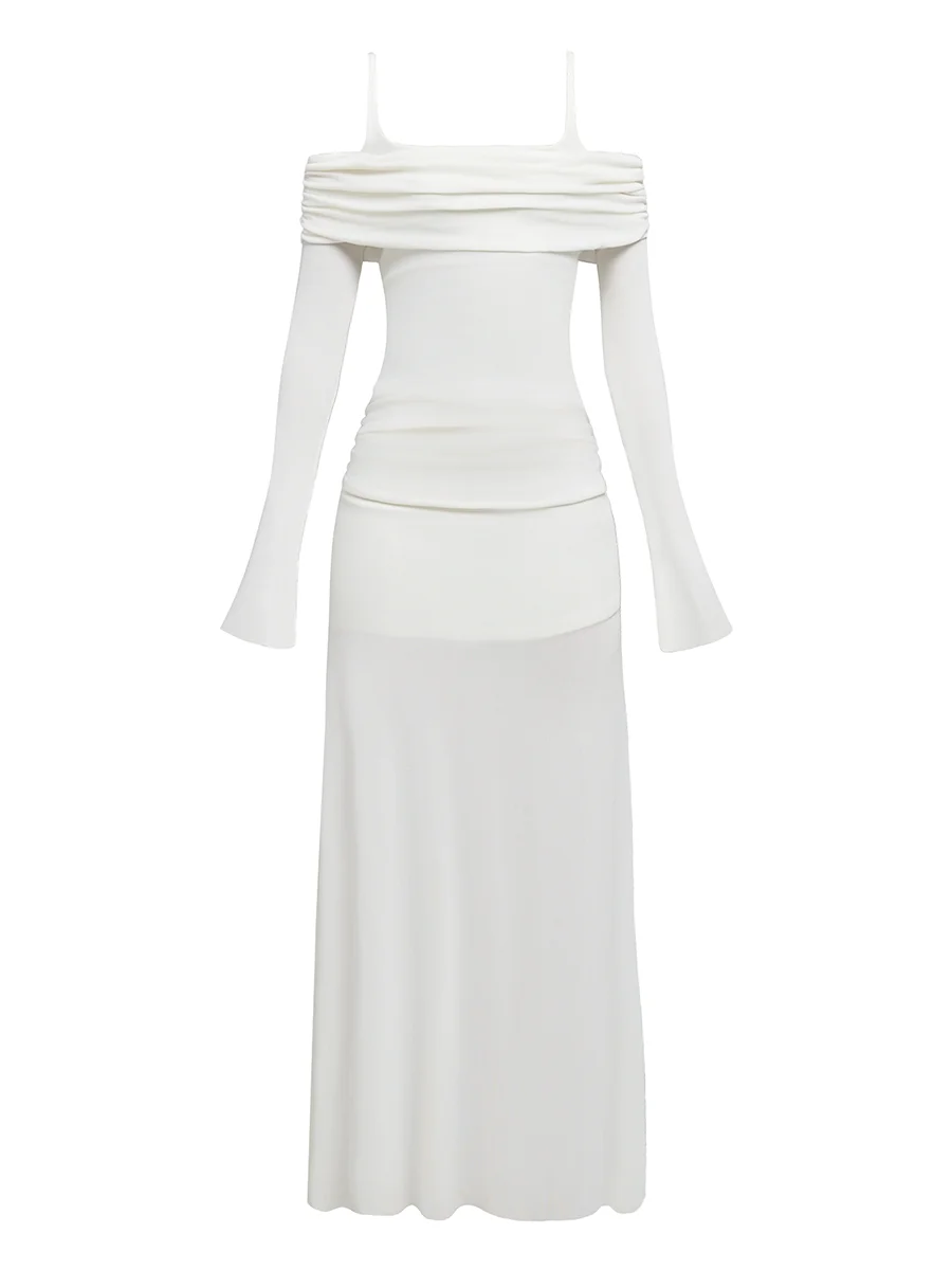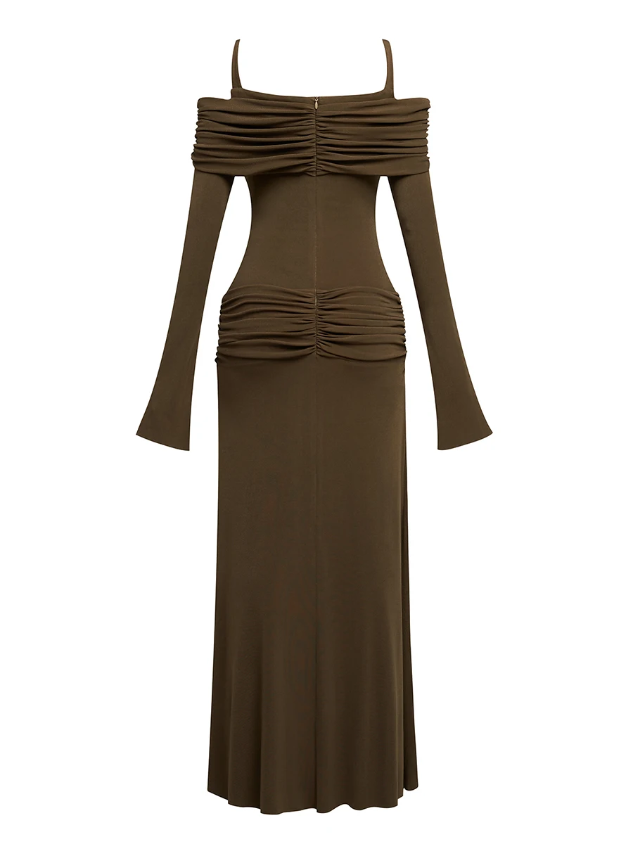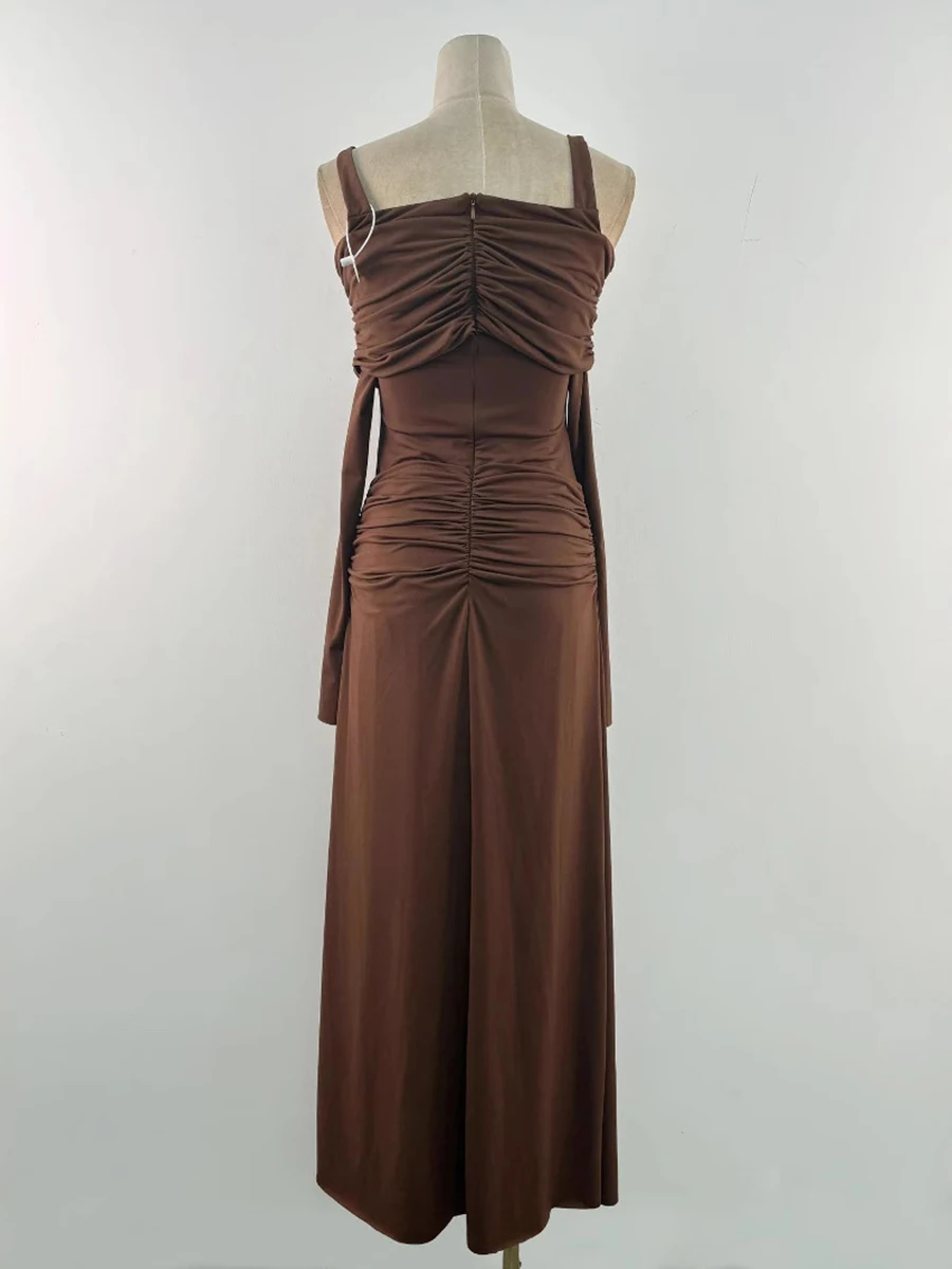 VGH Streetwear Backless Folds Long Dresses For Women Square Collar Off The Shoulder Sleeve High Waist Slim Solid Dress Female